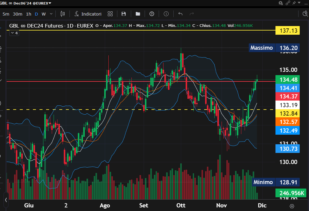 Il Bund future, punto di riferimento per il mercato obbligazionario europeo, continua a essere protagonista di movimenti significativi, riflettendo sia le dinamiche macroeconomiche sia le incertezze politiche e finanziarie globali. Negli ultimi giorni, il derivato ha raggiunto il target di brevissimo periodo fissato a 134.4, un livello che funge ora da switch per le prossime strategie operative.