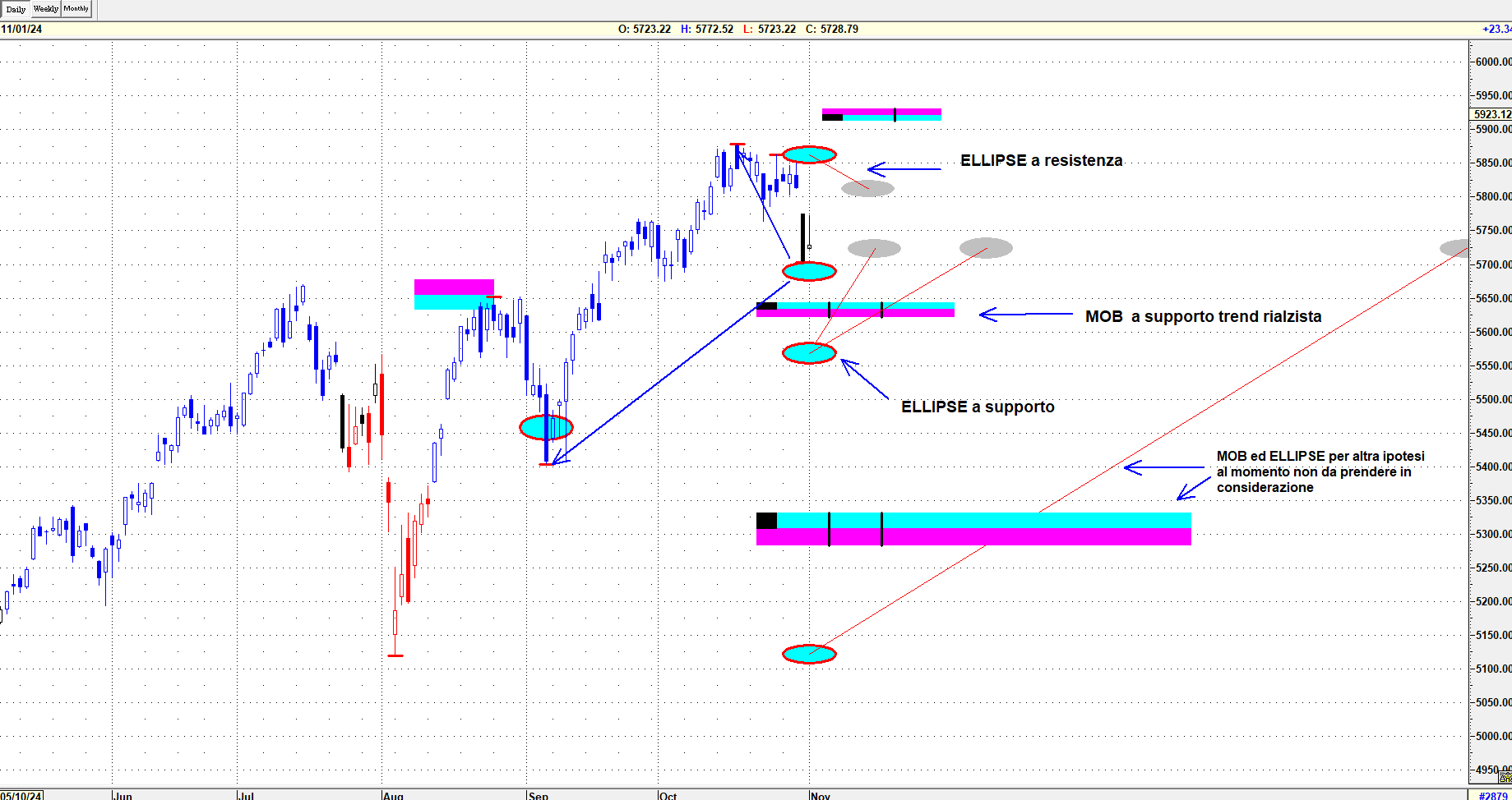 Dopo aver ripulito il grafico dai vecchi segnali per una maggiore chiarezza e facilità di lettura, osserviamo la formazione di una nuova ellipse tracciata dal massimo del 17/10 al minimo del 06/09, che ha temporaneamente arrestato l’indice (vedi grafico). Sotto, troviamo una MOB intorno all’area dei 5630 punti, che potrebbe fungere da supporto all'eventuale prosecuzione del ritracciamento. Sono inoltre presenti altre due ellipse di supporto attualmente in formazione.