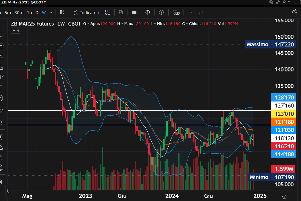 Anche il T-Bond, future sulle obbligazioni USA, vedrà la scadenza del contratto il 19 dicembre prossimo. A differenza del Bund, non si registrerà alcun effetto contango. La soglia switch fondamentale continua a essere posizionata ai 123 punti, un livello che rimane debole.