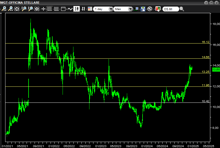 Le commesse in arrivo, anche da un colosso come Leonardo, confermano il quadro tecnico positivo del titolo Officine Stellari, già impostato favorevolmente con il superamento del valore chiave di 10,40 euro, considerato il livello switch attuale. Questo livello rappresenta il punto di ingresso principale per eventuali strategie di trading, con target successivi distribuiti in maniera graduale. Il primo supporto significativo è ora posizionato ai 12 euro, seguito da un ulteriore supporto tecnico a 13,20 euro superato qualche seduta fa.