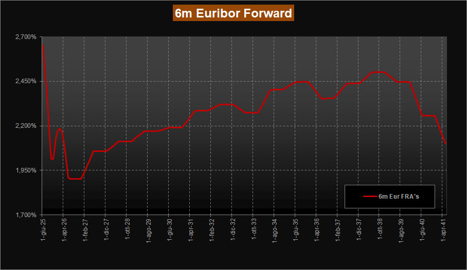 Nuovo assestamento per le previsioni fornite dai tassi forward su Euribor 6 mesi sulle scadenze a breve, con tassi attesi ora in area 2,65% per il secondo trimestre 2025 e la discesa verticale sulla parte a breve maggiormente accentuata rispetto alle scorse analisi. In consolidamento le aspettative sui tagli dei tassi cospicui da parte della Bce, che mantengono la curva dei forward sempre sotto la soglia del 2% (ora in area 1,90%) per i primi mesi del 2026. Stabili le previsioni di risalita dei tassi, visti ancora in area 2,45% nell’intervallo 2033-2038.