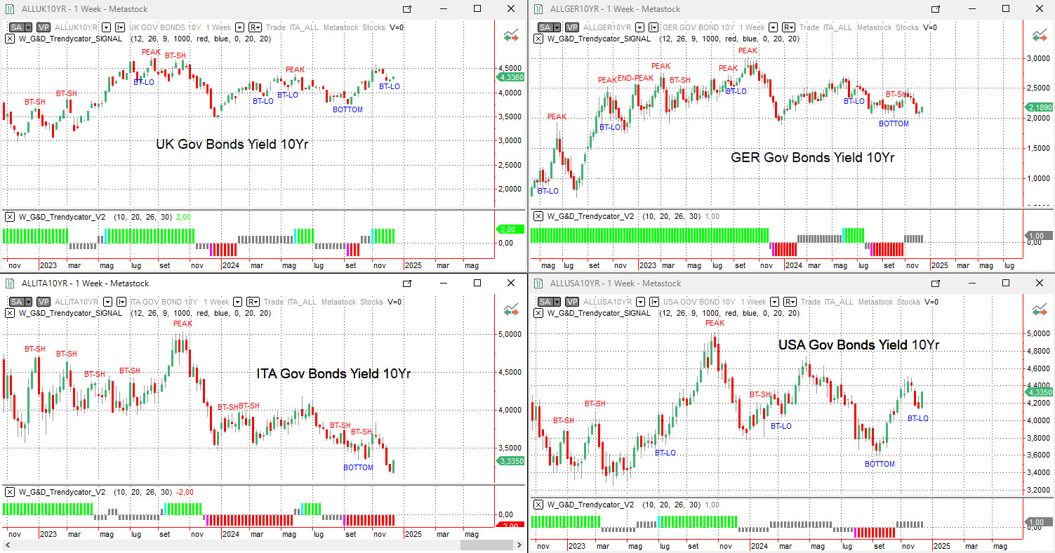 Analizzando con il Trendycator le curve dei rendimenti su scala settimanale dei principali benchmark decennali, non ci sono sostanziali mutamenti di fondo, delineandosi una certa lateralità dovuta alla scarsa incisività della Bce nell’ultima riunione.