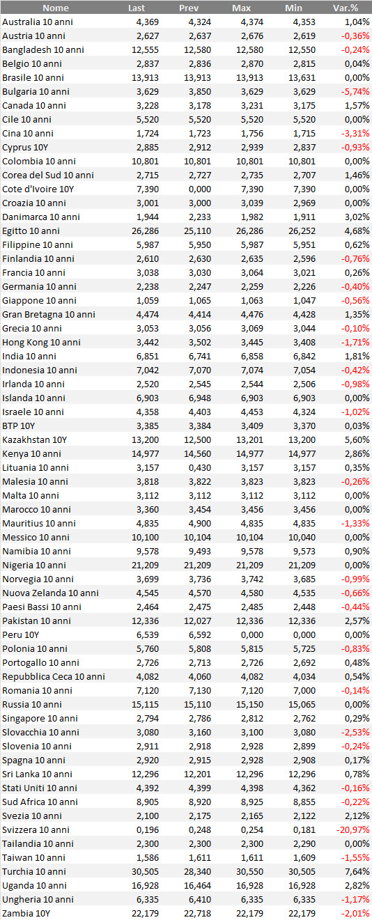 Rendimenti bond governativi benchmark mondiali