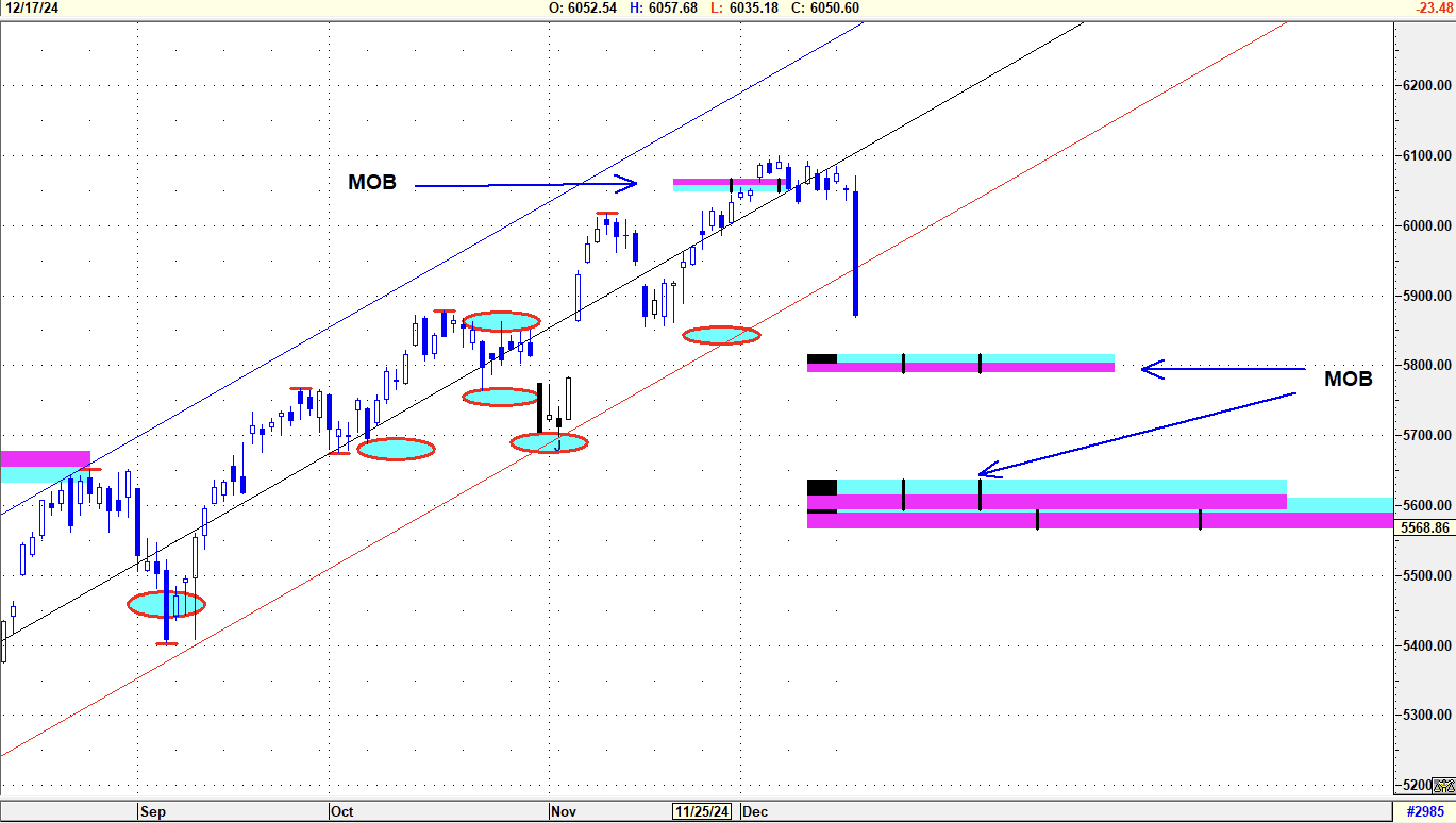 Di seguito il grafico aggiornato del s&p 500: sostanzialmente l’indice si è avvicinato alla prima MOB in area 5800 ed è uscito dal canale di regressione lineare.
