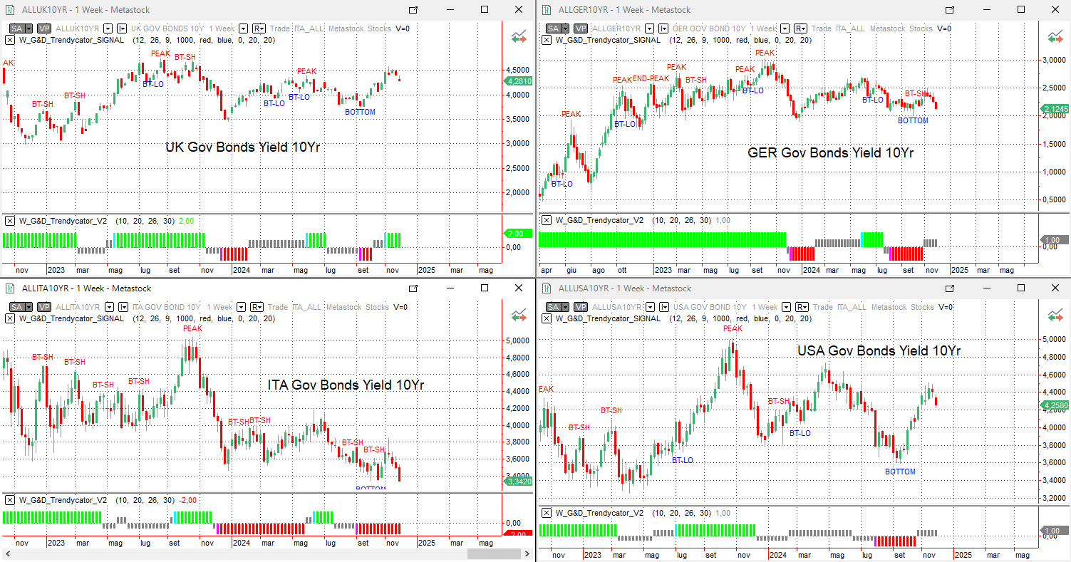 Analizzando con il Trendycator le curve dei rendimenti su scala settimanale dei principali benchmark decennali, la situazione si è decisamente sbloccata, con i bond che ora puntano con sicurezza sui tagli Bce.