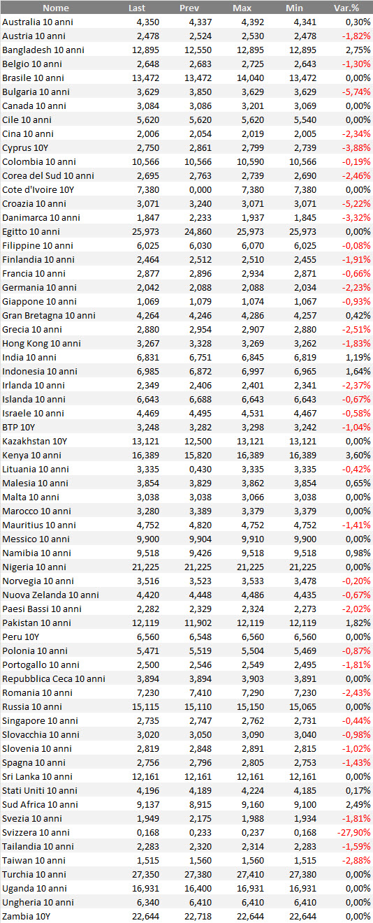 Rendimenti bond governativi benchmark mondiali