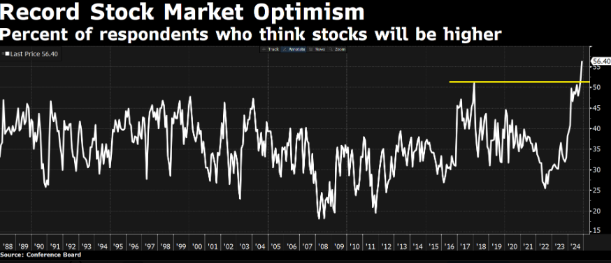Da rilevare che un dato pubblicato in settimana relativo alla Consumer Confidence è che la percentuale di consumatori che si aspetta prezzi dell'azionario più alti ha raggiunto il massimo storico.