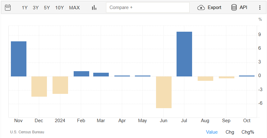 E anche il dato preliminare di ottobre sugli ordini dei beni durevoli escono sotto attese, dando il medesimo messaggio. Il dato mensile preliminare di ottobre registra un +0,2%, rispetto al –0,4% di settembre (rilevazione rivista da –0,7%). Il dato è rilasciato dall’U.S. Census Bureau.
