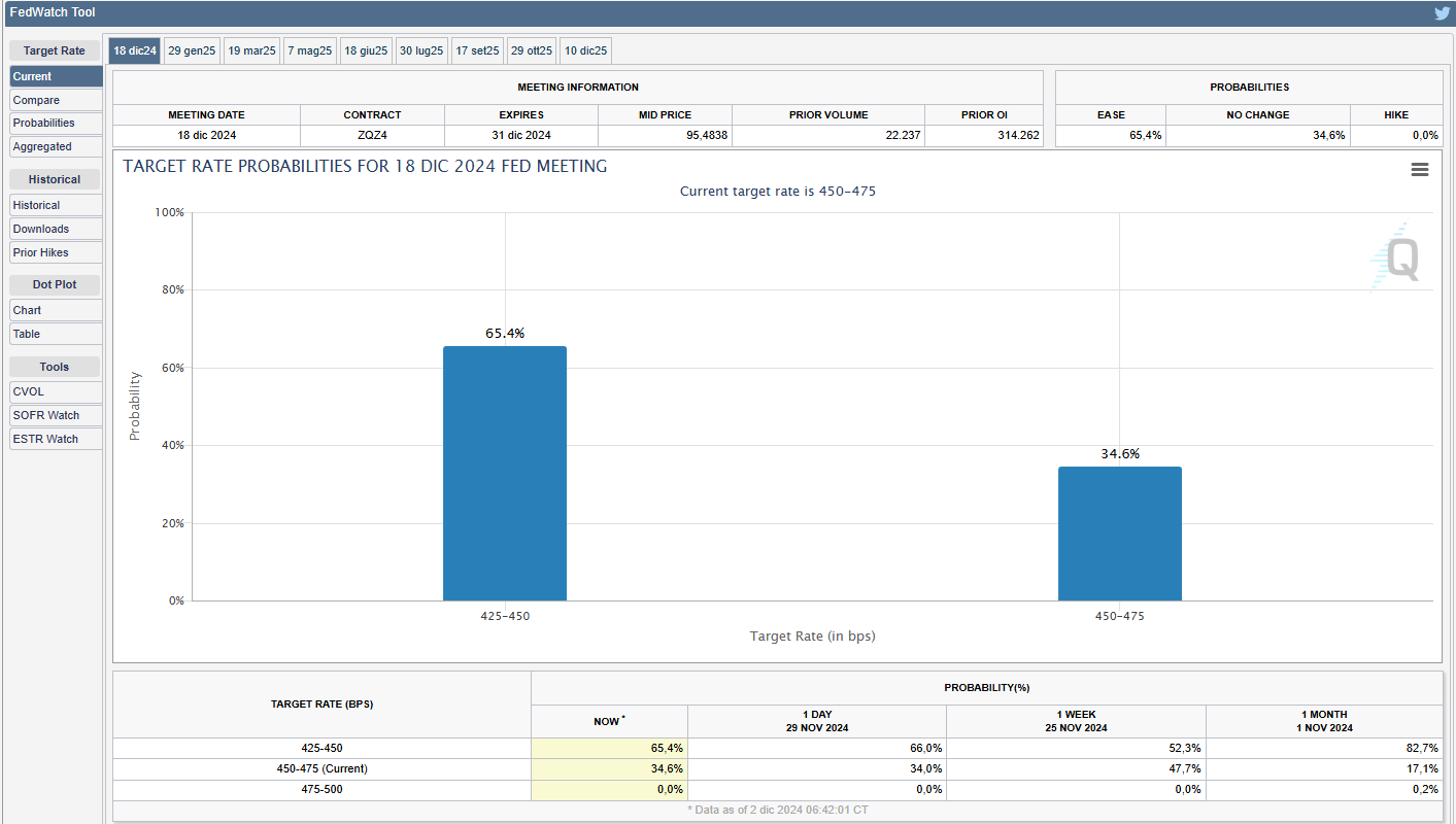 per l’ultima riunione del 2024, risalgono nuovamente le probabilità per un taglio di 25 bps che passano dal 52,3% di lunedì scorso, all’attuale 65,4%. Conseguentemente scendono le probabilità relative a nessun taglio che dal 47,7% di lunedì scorso passano all’attuale 34,6% (v. grafico):
