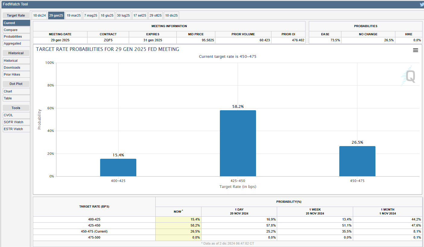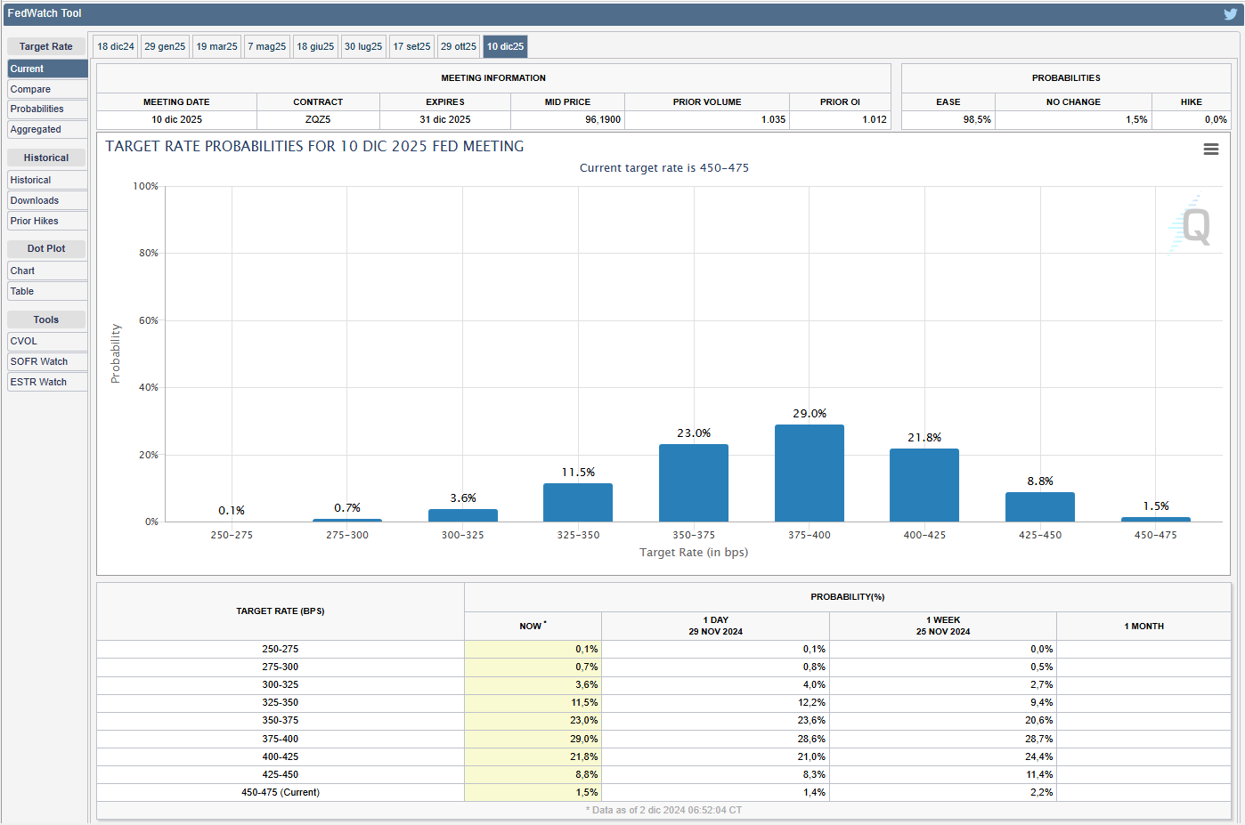 Sembra più un effetto della presa di beneficio sul Dollaro, dopo che anche i rendimenti USA hanno iniziato a correggere significativamente. Ma i rendimenti, con gli spauracchi del PCE e delle Minute FOMC alle spalle, sono scesi di parecchio portandosi dietro anche la correzione del Dollaro. I trader hanno aggiunto scommesse sul fatto che la FED abbasserà i tassi di 25 punti base nella riunione di dicembre, secondo FedWatch del CME. Tuttavia, prevedono che la banca centrale lascerà i tassi invariati nelle riunioni di gennaio e marzo. Goldman Sachs ha affermato in una nota la scorsa settimana che un'escalation della politica tariffaria rischia di ritardare il ritorno all'obiettivo di inflazione del 2,0%. Ci sono dubbi sugli effetti della politica tariffaria dichiarata da Trump, che, se attuata, potrebbe essere piuttosto inflazionistica e quindi la FED dovrà trovare un equilibrio tra i dati economici e il programma politico della nuova amministrazione.