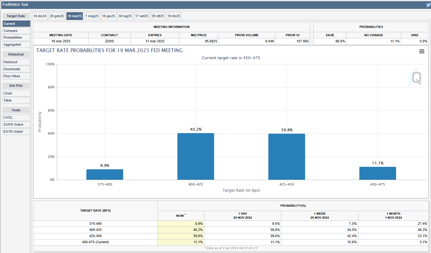 Anche su questa nuova scadenza, quella del 19 marzo 2025, cambia lo scenario. Ora comandano le probabilità di un taglio per complessivi 50 bps che dal 34,5% di lunedì scorso passano all’attuale 40,2% contro le probabilità per un taglio di soli 25 bps prezzato al 39,8% dal 42,4% di lunedì scorso. In discesa all’11,1% anche la percentuale delle probabilità di nessun taglio (v. grafico):
