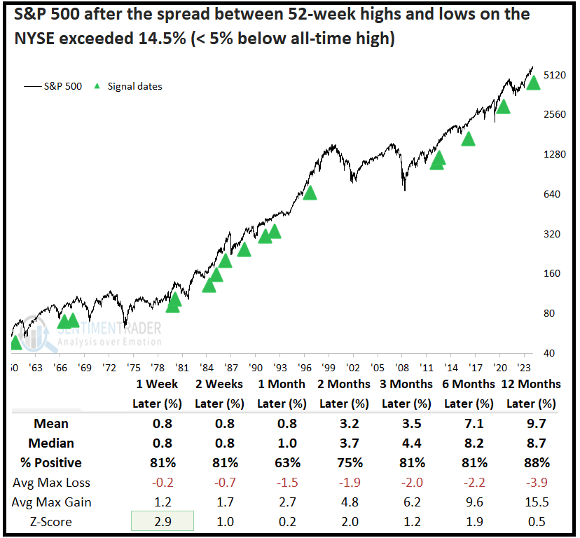 L’altro studio riguarda l’ampiezza del mercato. Il rally seguito alle elezioni aveva fatto balzare la percentuale netta di titoli ai massimi da 52 settimane (% ai massimi da 252 settimane meno percentuale ai minimi da 52 settimane) su livelli assai elevati, ma il successivo consolidamento l’aveva riportata a zero. Dopo di ché questa percentuale è rapidamente e violentemente ritornata sui massimi. Questo tipo di movimento ha prodotto in media un tasso di vincita dell’88% ad un anno. Una volta di più, non è una azione dei prezzi tipica dei top.