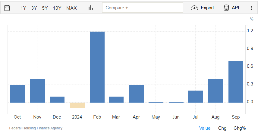L’indice di prezzo delle case a livello mensile a settembre registra una crescita del +0,7%; ad agosto era stata registrata una crescita dello 0,4% (rivista da +0,3%). Il dato è rilasciato dal Federal Housing Finance Agency.
