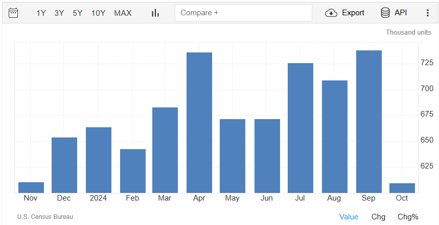 Le vendite di case nuove hanno clamorosamente deluso il consenso, mostrando il maggior calo dal 2013. Il dato sulle vendite di nuove case a ottobre si attesta a 610mila, contro la rilevazione di settembre che era di 738 mila (rivista da 716 mila). Il dato è rilasciato dall’U.S. Census Bureau.