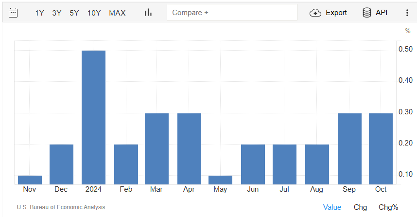E veniamo all'atteso PCE di ottobre. Headline e core sono usciti in linea con le attese, il che lascia le cose come stanno sul fronte inflazione. L’indice di prezzo delle spese per consumi personali core (che esclude il settore del cibo e dell’energia) a livello mensile a ottobre è cresciuto dello 0,3%, come indicato dal consensus e dallo +0,3% di settembre.