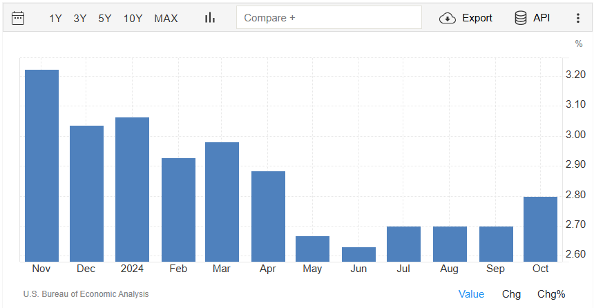 A livello annualizzato, a ottobre sale il dato al 2,8%, dal precedente 2,7% di settembre e uguale al consensus del 2,8%. I dati sono rilasciati dall’U.S. Bureau of Economic Analysis.
