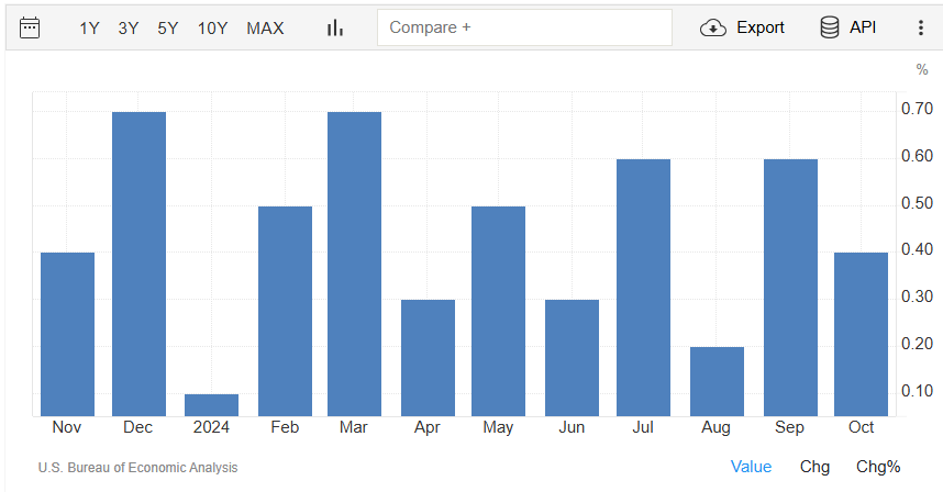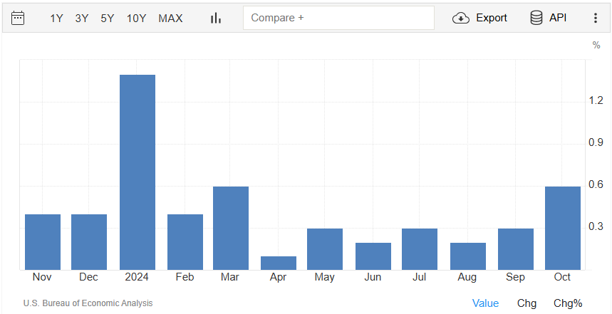La spesa personale su base mensile a ottobre registra un +0,4%, sotto al dato di 0,6% di settembre (rivisto da 0,5%) e uguale al consensus del +0,4%. Il dato è rilasciato dall’U.S. Bureau of Economic Analysis.