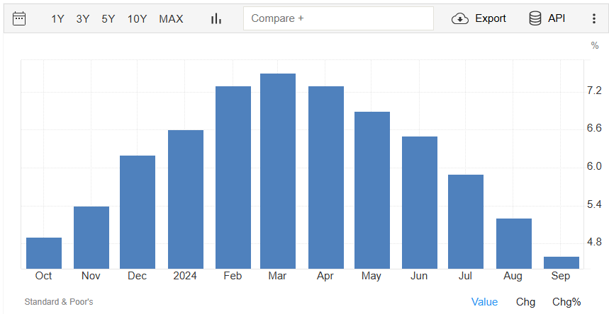 L’S&P/Case-Shiller Home Price Index, che valuta le variazioni nel valore del mercato immobiliare residenziale in 20 regioni degli USA, a livello mensile a settembre si conferma allo 0,3% come il dato del mese di agosto. Su base annua, ad agosto si registra una piccola crescita al 4,6%, dopo il + 4,5% di agosto, ma nettamente inferiore al consensus che prevedeva un aumento al 5,2%.