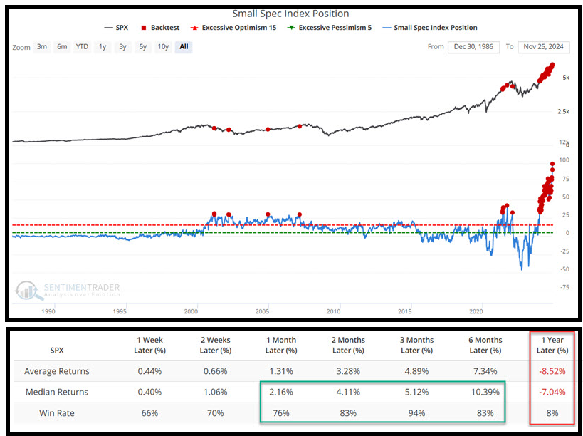 La categoria di investitori rinomata per avere il peggior timing sui mercati, sono gli ‘small speculators’. Al momento essi sono fortemente investiti. La peculiarità di questo backtest è che le performance prospettiche sono ottime per i successivi 6 mesi, ma precipitano a 12 mesi, una conferma statistica dell’argomento che posizionamento e sentiment possono restare eccezionalmente positivi per un po’ senza causare immediatamente una correzione seria.