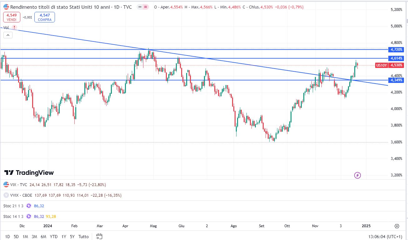In un contesto di mercato tricky ho preferito fare un pò di pulizia di portafoglio liquidando posizioni in stop loss su alcuni strumenti finanziari non azionari e liquidando in stop profit alcune piccole posizioni di medio termine su titoli italiani, anche se il trend di lungo periodo rimane al momento intatto. Il motivo è presto detto: anche se l'Europa appare più forte degli Stati Uniti, il fatto che i rendimenti statunitensi si siano riportati al di sopra del 4.5% pone potenzialmente le basi per delle vendite sull'azionario. E come ben sapete se gli Stati Uniti si mettono a scendere, alla vigilia dell'insediamento di Trump che certamente farà qualcosa all'inizio del mandato, inevitabilmente anche l'Europa ne potrebbe risentire. Considerate poi che l'ultima gamba al rialzo dal 4.2% a quasi 4.6% avviene DOPO un movimento che in un solo mese ha visto il rendimento passare dal 3.60% ai livelli attuali ed è veramente un range molto ampio in un lasso di tempo così breve e questo potrebbe creare una alternativa all'azionario che gira su multipli elevati. Di seguito il grafico del rendimento statunitense a 10 anni.