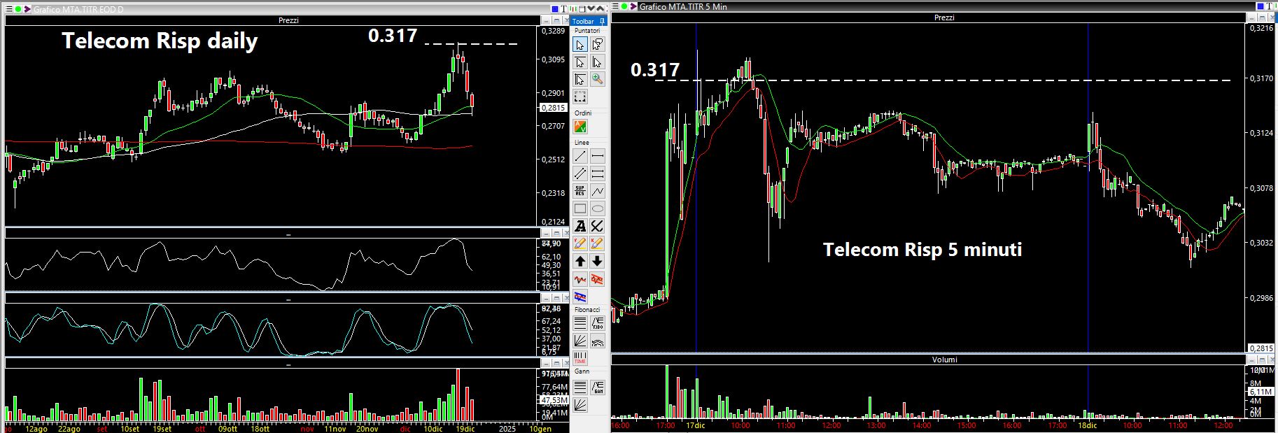 L'operazione di Vivendi ha aperto all'ipotesi di vendere la propria quota in Telecom e questo ha fatto salire il titolo anche perché Vivendi l'aveva acquistata a prezzi decisamente più alti rispetto alla quotazione attuale. Questo ha permesso inizialmente di far salire il titolo salvo poi far invertire la rotta già dal giorno successivo. Lo ricordo bene perché c'era un software tarato con piccolissime quantità in acquisto che però continuava a rigenerare la lettera: dava l'impressione di voler comprare e in realtà vendeva. Personalmente ho fatto due ottime operazioni ma non è questo il punto che voglio evidenziare quanto la rischiosità di questo mercato: vi sareste aspettati un movimento a "V" rovesciata senza nemmeno "sentire" la vecchia resistenza (livello di breakout sul daily) poi diventato supporto? Io no.