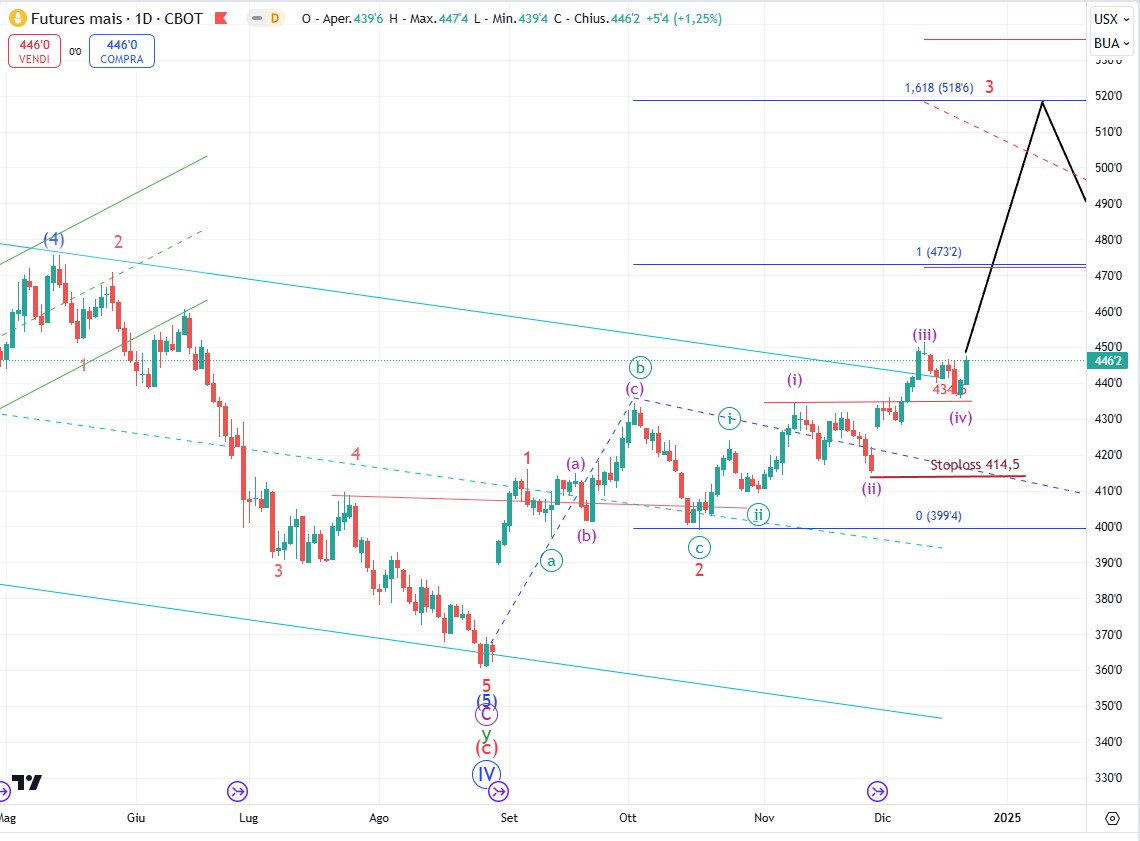 Il mais ha realizzato l’onda (iv) di grado Minuette e adesso dovrebbe uncinare al rialzo.