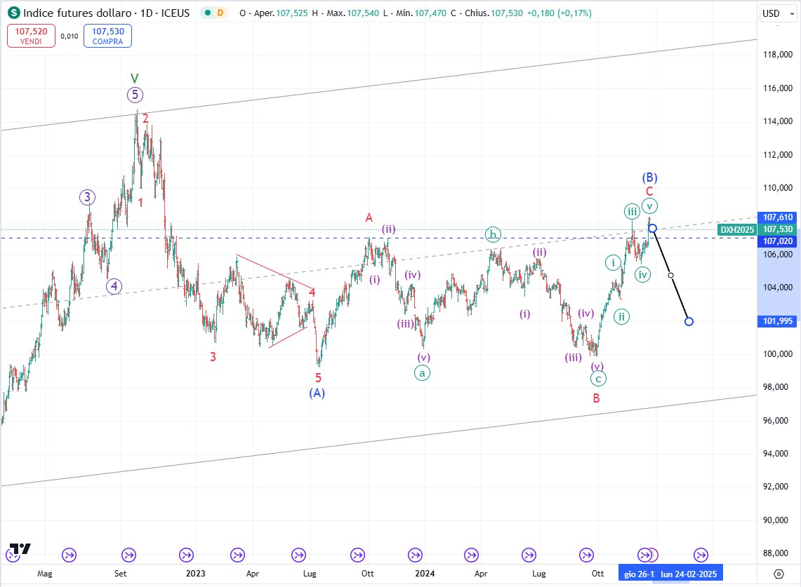 Il NASDAQ ha raggiunto il massimo a 22.425 punti bella seduta di martedì 17 dicembre esattamente sulla proiezione del 138,2% di onda 4 e da lì l’indice è sceso a sfiorare il precedente massimo di onda 3 nella seduta di venerdì ritracciando circa il 50% del calo precedente. Anche in questo caso la lettura è quella di una seconda onda che dovrebbe esaurirsi a breve per lasciare spazio ad un’onda [iii] che scenderà molto più in basso del minimo di onda [i]. Solo il superamento del massimo del 17 dicembre potrà annullare questo modello portando a nuovi massimi storici.