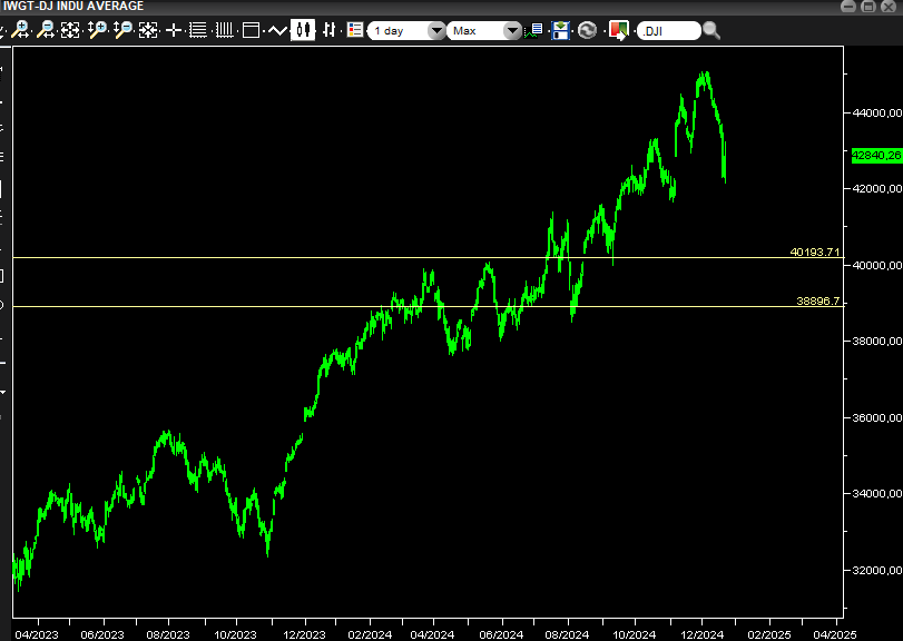 Il mercato americano continua a guidare le dinamiche globali. Il Dow Jones ha iniziato il 2024 a 37.300 punti, raggiungendo i massimi storici di 45.000 punti prima di ritracciare a 42.800 punti conseguendo un guadagno totale del 14,75%. Per il 2025, i livelli critici saranno 40.200 punti e 38.900 punti.