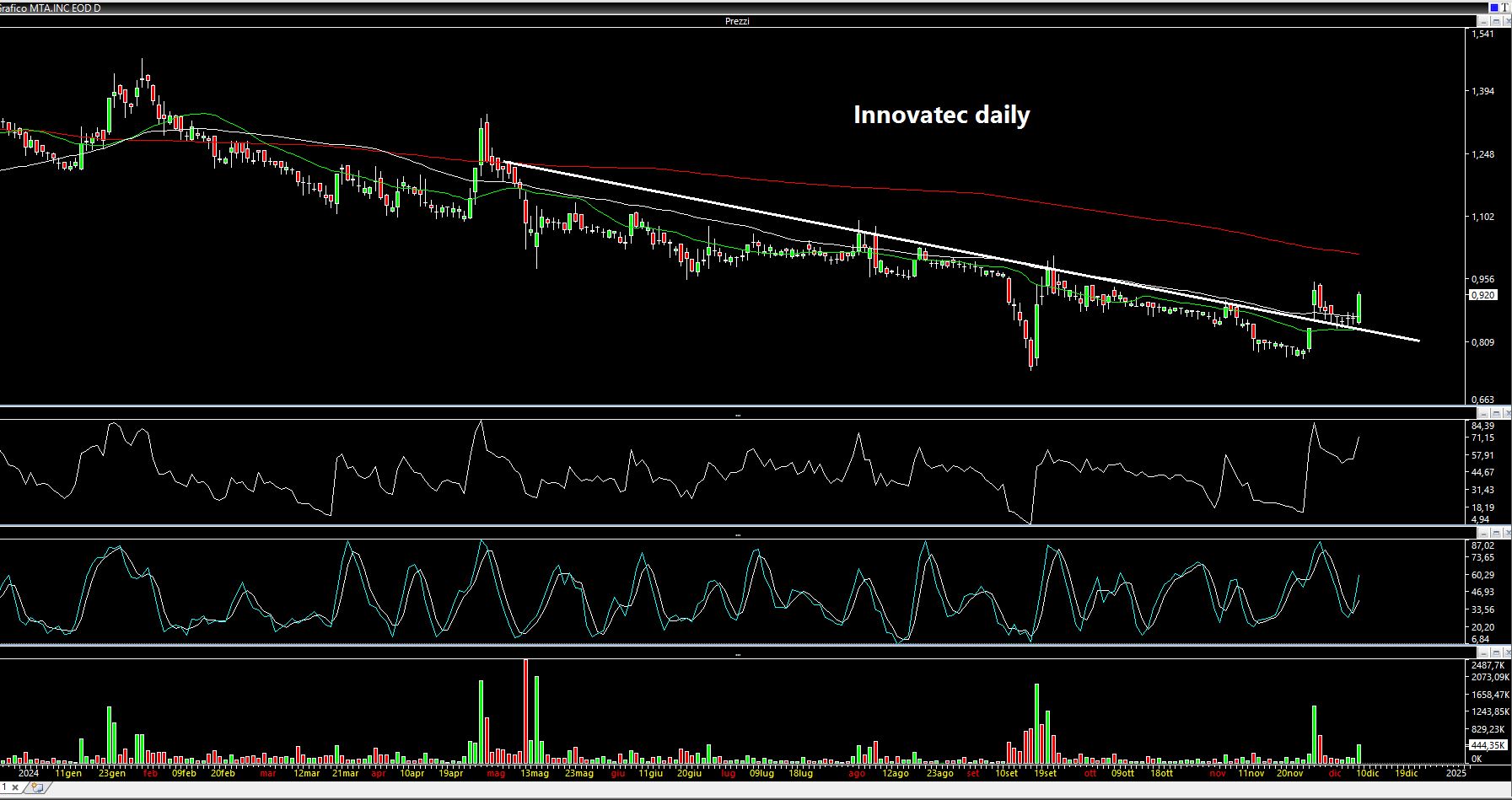 Rotta la trendline ribassista con volumi in leggerissimo aumento. Brutto un rientro sotto la trendline medesima.