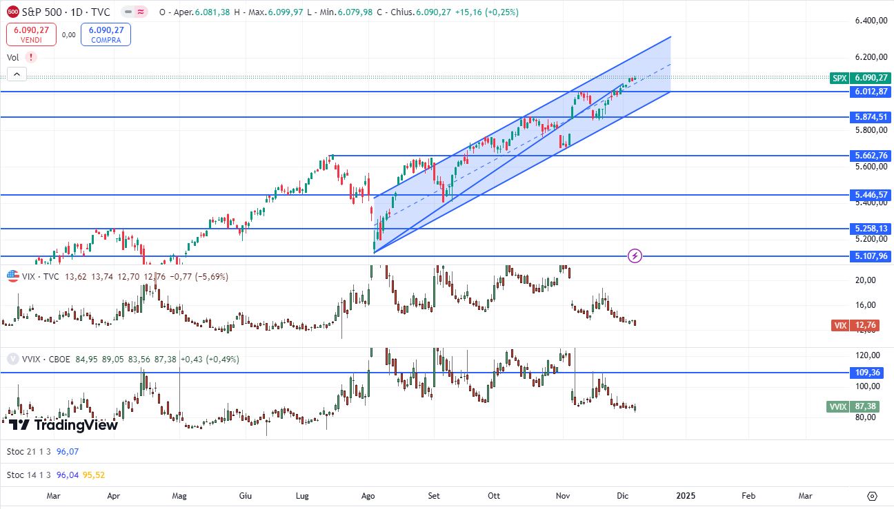 Il grafico parla da solo: finchè si rimane sopra la vecchia resistenza in area 6000 la view è long. vengono i brividi ma è così. Volatilità in calo anche se il VVIX è salito leggermente nella seduta di venerdì, non confermando il ribasso espresso dal VIX. Per il momento non ci sono preoccupazioni, il che equivale a dire che non c'è spazio per lo short e che i ribassi sono potenziali occasioni di acquisto.
