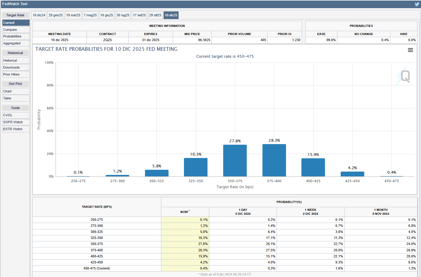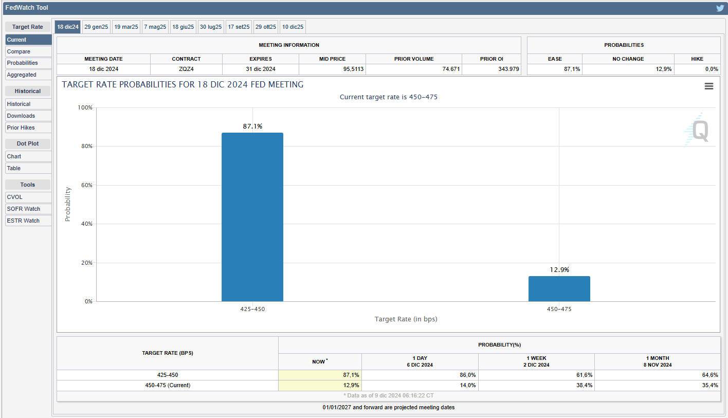 per l’ultima riunione del 2024, salgono notevolmente le probabilità per un taglio di 25 bps che passano dal 65,4% di lunedì scorso, all’attuale 87,1%. Conseguentemente scendono le probabilità relative a nessun taglio che dal 34,6% di lunedì scorso passano all’attuale 12,9% (v. grafico):