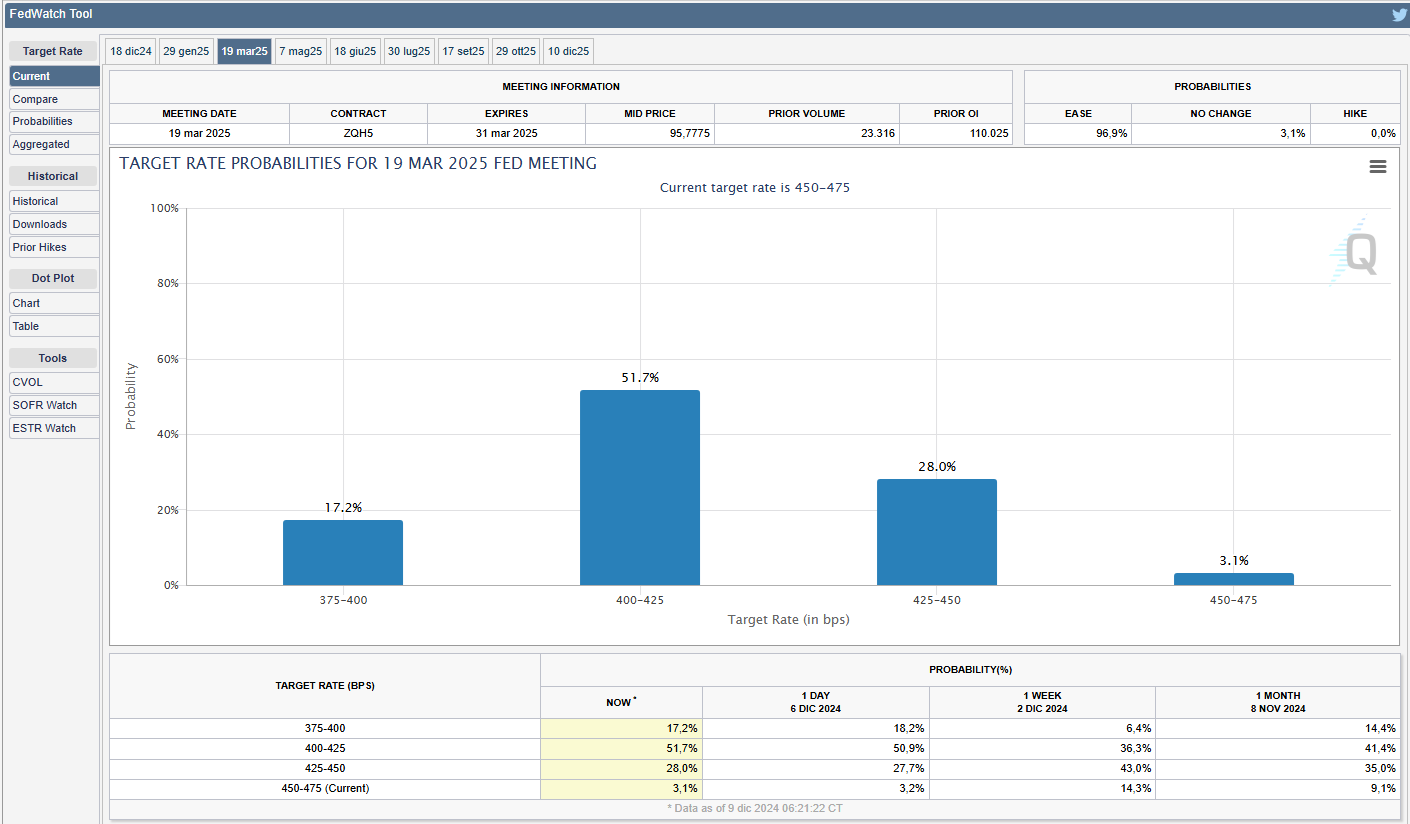 Anche su questa nuova scadenza, quella del 19 marzo 2025, si conferma lo scenario di un taglio per complessivi 50 bps (25+25) con le probabilità che dal 40,2% di lunedì scorso passano all’attuale 51,7% contro le probabilità per un taglio di soli 25 bps prezzato al 28,0% dal 39,8% di lunedì scorso. In rialzo al 17,2% anche la percentuale delle probabilità di tagli per complessivi 75 bps (v. grafico):