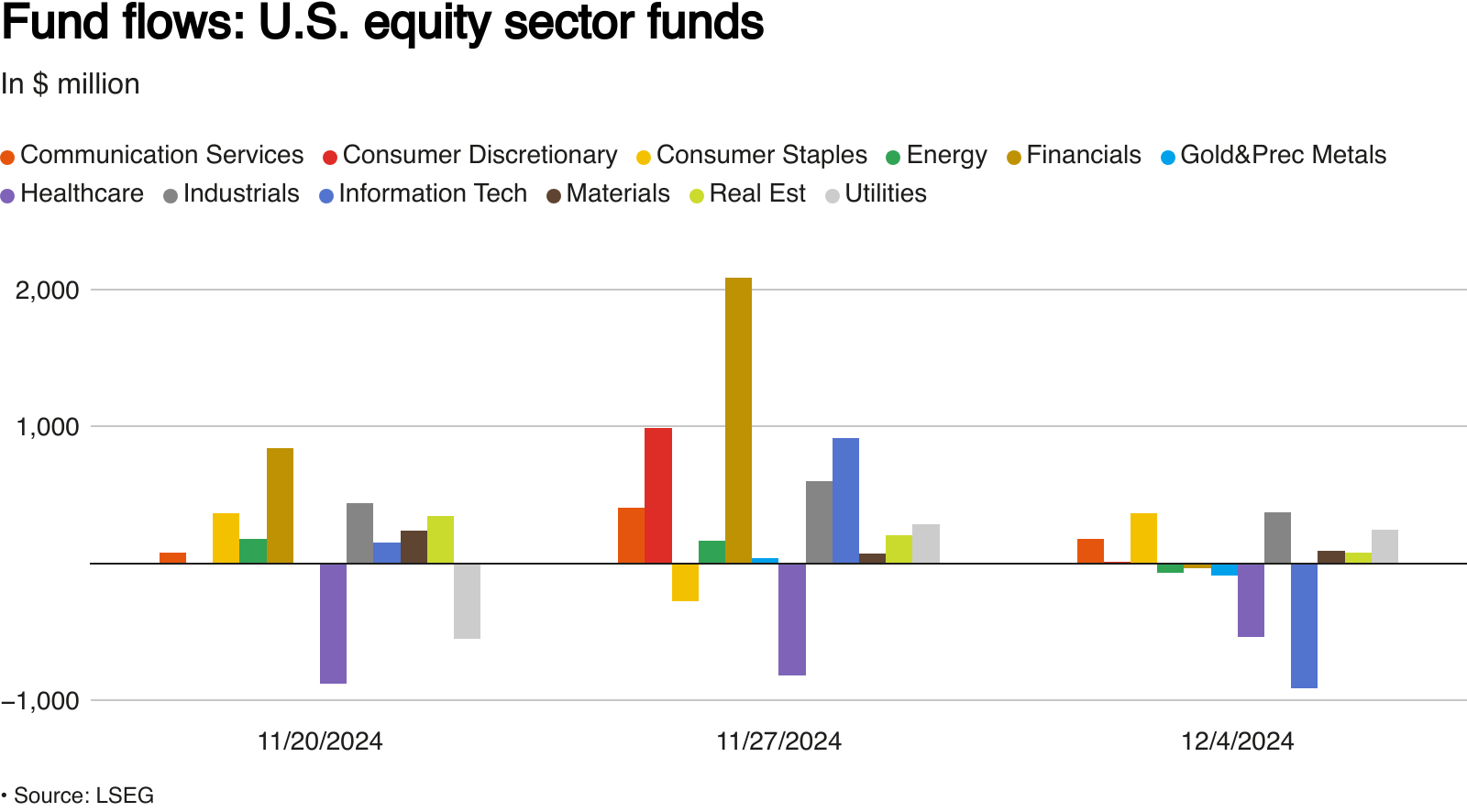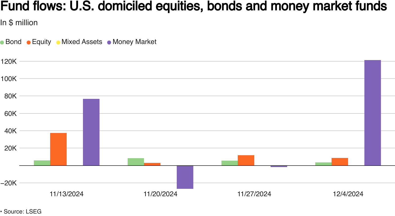 Diamo ora uno sguardo ai movimenti sui fondi. Gli investitori statunitensi hanno fatto incetta di fondi azionari per la quinta settimana consecutiva fino al 4 novembre, spinti dal rally dei principali indici di Wall Street, dall'ottimismo per una forte crescita economica e dalle aspettative di un terzo taglio consecutivo dei tassi della Federal Reserve questo mese.