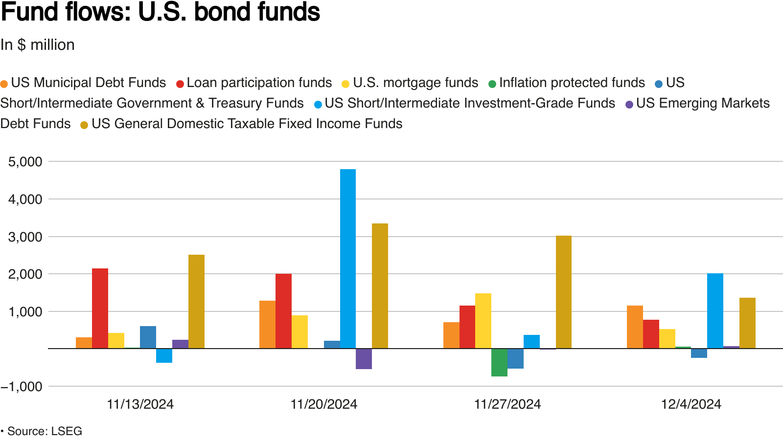 I fondi obbligazionari nazionali imponibili di grado di investimento da breve a intermedio e i fondi obbligazionari municipali hanno comunque ricevuto rispettivamente significativi afflussi per un valore di 2,01 miliardi di $, 1,36 miliardi di $ e 1,15 miliardi di $.