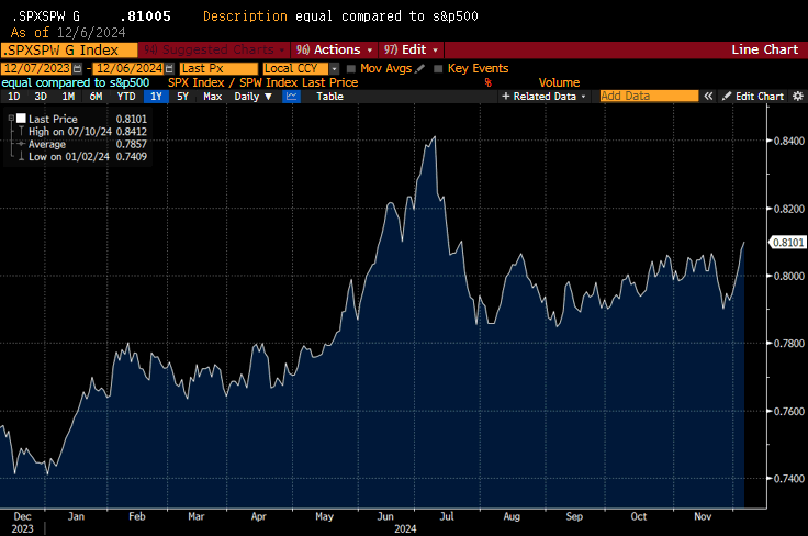 Allo stesso modo notiamo che l’indice S&P500 Equal Weighted ha ceduto l’1,29% aumentando lo spread dal 7,93% di due venerdì fa all’attuale 10,66% vanificando l’overperformance della seconda metà di novembre che è stata più che ritracciata (vedi sotto il grafico del ratio).
