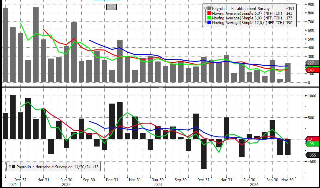 I dati sul mercato del lavoro di novembre, pubblicati venerdì scorso, in aggregato non sono stati da disprezzare, ma nemmeno rappresentativi di un mercato del lavoro USA in accelerazione particolare, e con un dato riveniente dall’indagine sulle famiglie, costantemente più debole del dato sui nuovi occupati, come visibile nel seguente grafico: