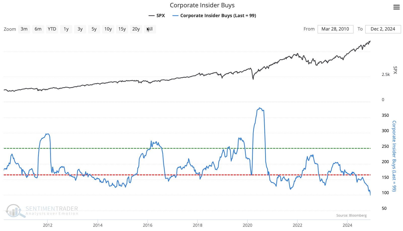Solitamente questi livelli di ipercomprato (75 di RSI, le serie positive, etc.) portano a consolidamenti di qualche tipo in tempi non troppo lunghi. Tra l’altro, è interessante notare che gli insiders hanno praticamente smesso di comprare a questi livelli, che evidentemente giudicano cari nel breve, a prescindere dal quadro economico e dai fondamentali.