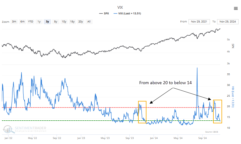 Ripetiamolo ancora una volta, questo tipo di momentum non si riscontra vicino ai top del mercato. I trend prima di invertirsi si indeboliscono, solitamente. Sentimentrader.com ha illustrato un altro backtest che conferma questo argomento: Il VIX, volatilità implicita nei prezzi delle opzioni dell’S&P500, è crollato in un mese da oltre 20 punti a meno di 14, a segnalare un radicale cambiamento di scenario degli operatori, da prudente a euforico.