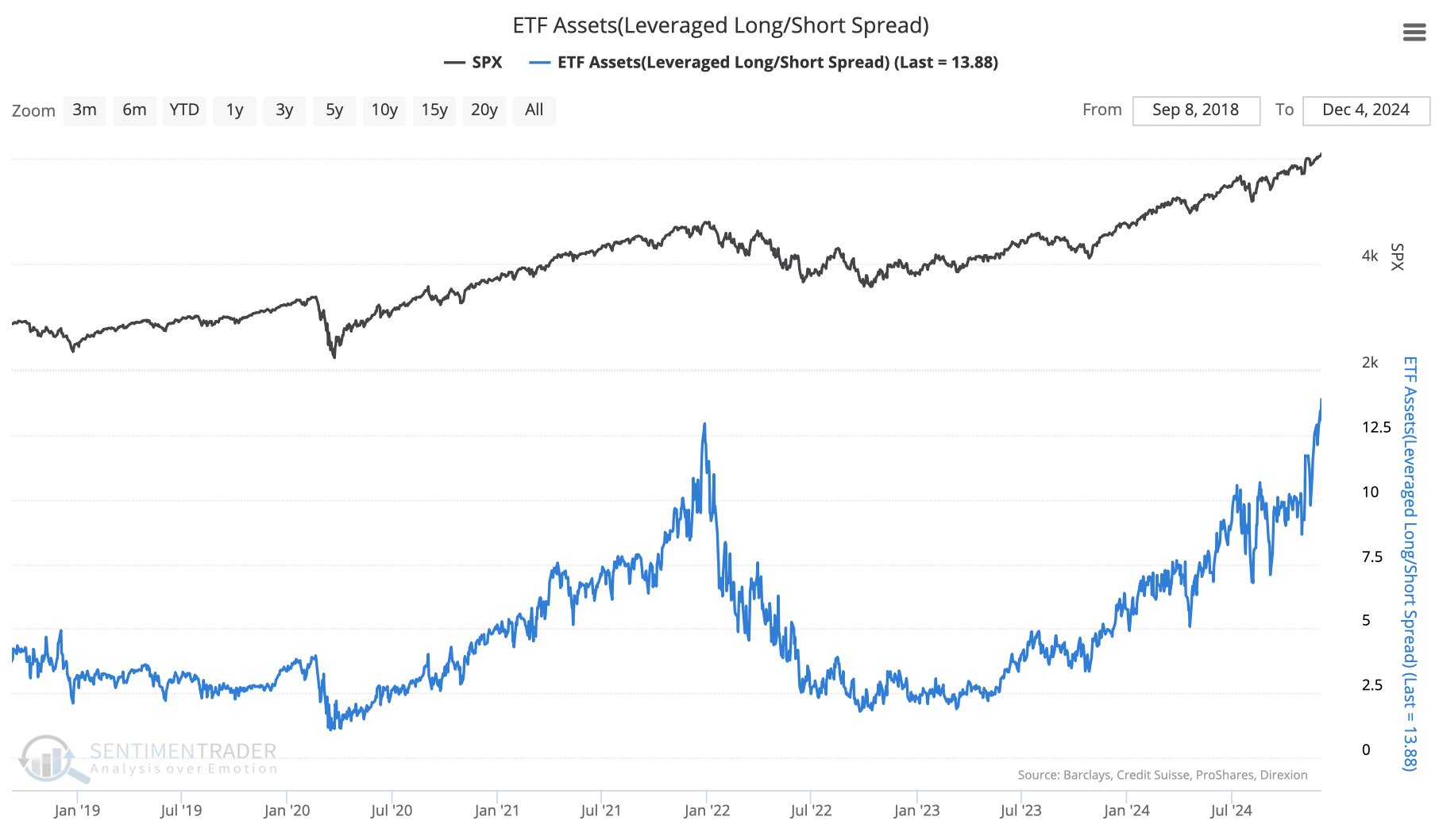 Le indicazioni di eccesso di euforia sul mercato si stanno accumulando, con l’indice S&P500 che è stato scambiato a 22,6 volte gli utili previsti per i prossimi 12 mesi, il suo rapporto P/E più alto in più di tre anni. Tanto per citarne alcune, Sentimentrader.com ha rilevato che i flussi in entrata dentro i veicoli levereggiati al rialzo sono cresciuti del 16% nelle ultime 3 settimane, e ci sono 14 dollari investiti negli ETF a leva al rialzo per ogni dollaro in un ETF a leva al ribasso su Wall Street al momento, nuovo massimo storico del ratio.