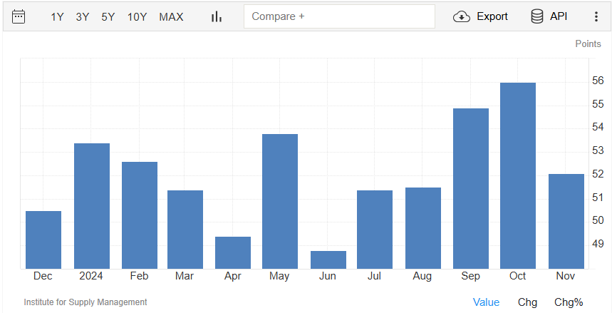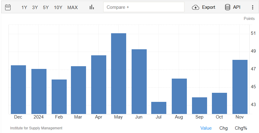 Il dato sui nuovi ordini nel settore manifatturiero rilasciato da ISM, invece, passa dai 47,1 punti di ottobre ai 50,4 punti di novembre.