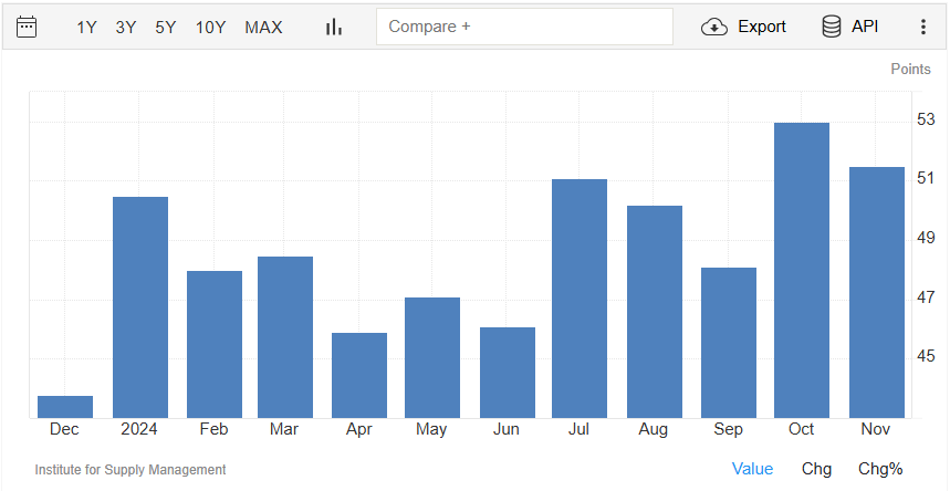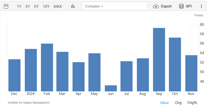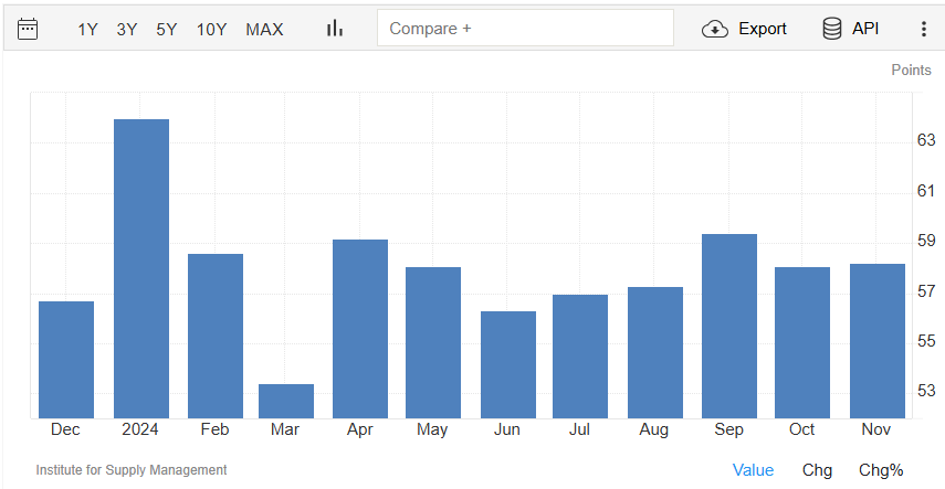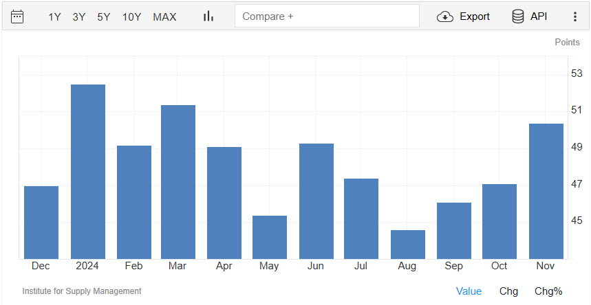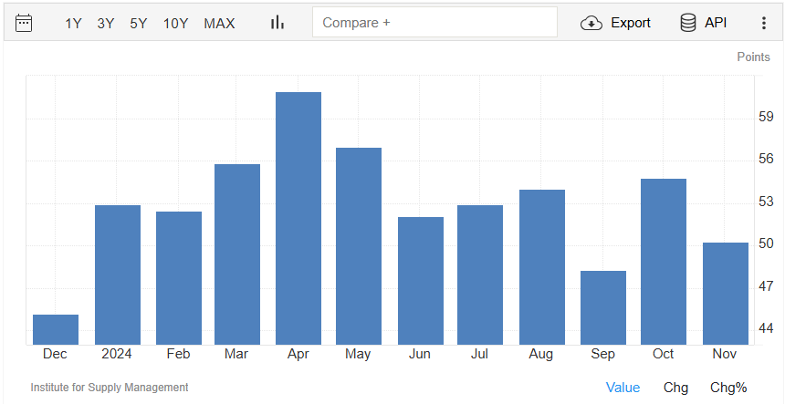 Sempre per quanto riguarda il settore manifatturiero, il dato sui prezzi rilasciato da ISM a novembre si attesta a 50,3 punti in calo rispetto ai 54,8 punti di ottobre.