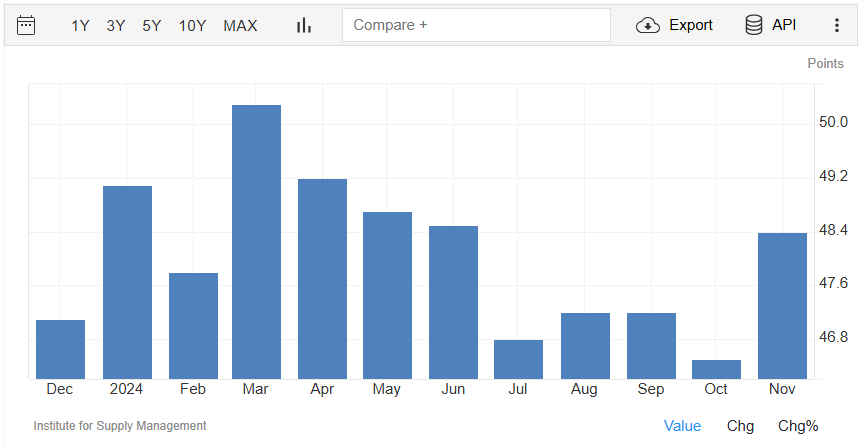 Il PMI manifatturiero rilasciato da ISM a novembre è aumentato a quota 48,4 punti dal 46,5 di ottobre e dal 47,5 del dato preliminare.