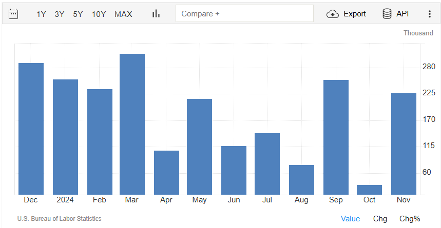 I nuovi occupati nel settore non-agricolo nel mese di novembre sono stati 227 mila, ben oltre il dato di ottobre pari a 36 mila (rivisto da 12 mila) e sopra al consensus pari a 200 mila unità.