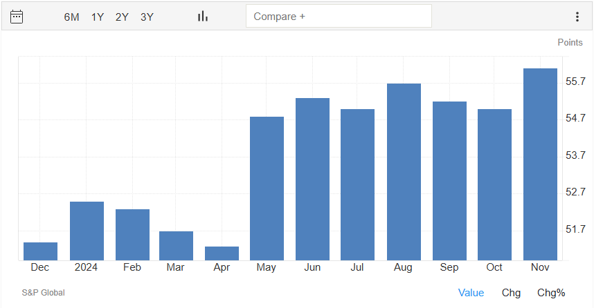 Il dato finale delle PMI relativo al settore dei servizi rilasciato da S&PGlobal a novembre è pari a 56,1 punti, di poco sotto al dato preliminare di 57,0 punti ed in calo rispetto ai 55,0 punti di ottobre.