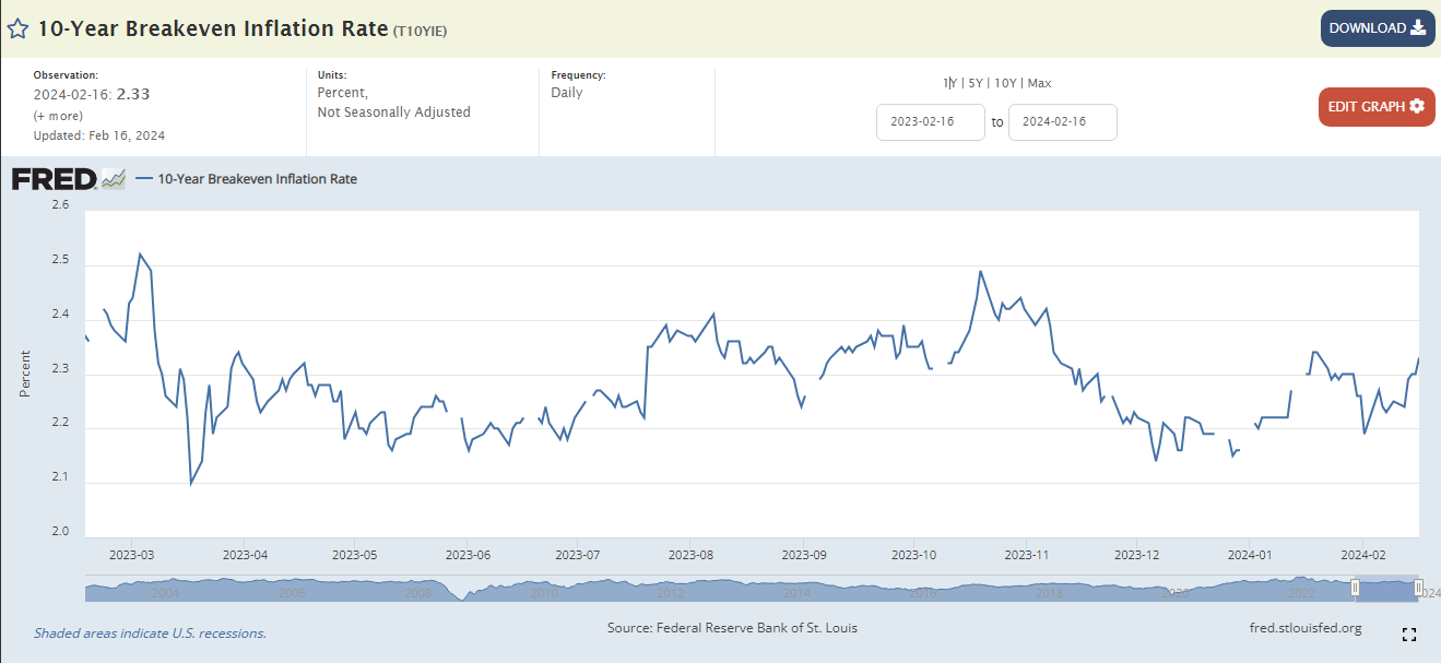 Infine i tassi reali, al netto dell’attuale tasso di inflazione, in ulteriore lieve risalita dal 2,30% di inizio febbraio all’attuale 2,33% (v. grafico FED di S.Louis):
