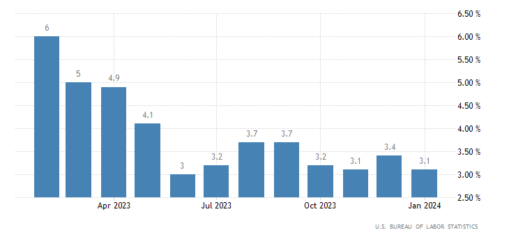 L’indice dei prezzi al consumo a livello annualizzato a gennaio si attesta al 3,1%, appena oltre un consensus del 2,9%, ma calando comunque rispetto al 3,4% di dicembre. Il dato è rilasciato dall’U.S. Bureau of Labor Statistics.