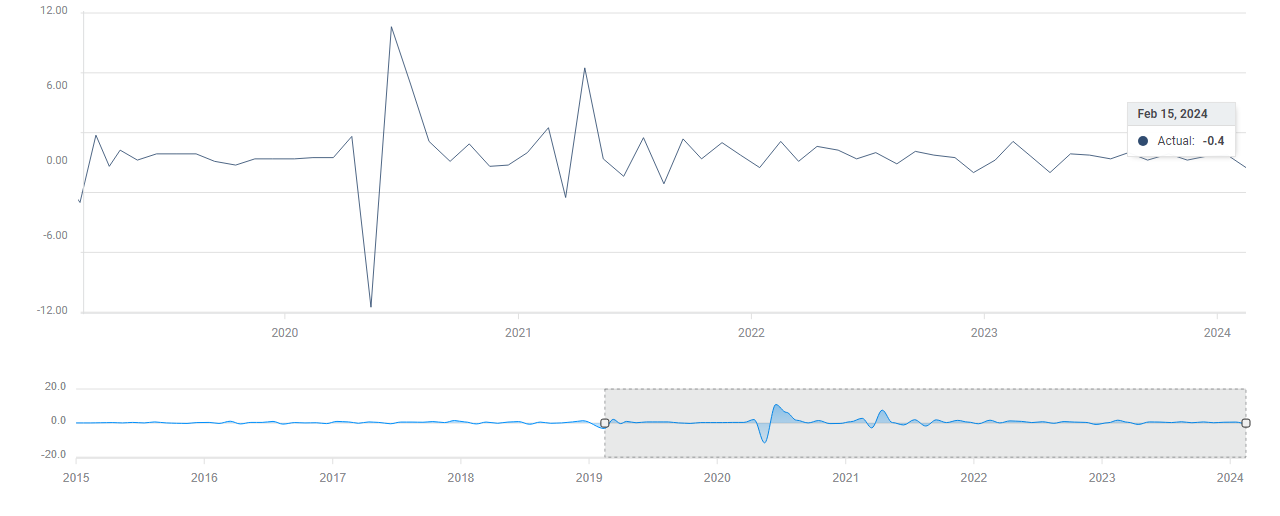 Il rialzo si è fatto più corposo nella giornata di giovedì, grazie alla pubblicazione dei dati macro relativi alle vendite al dettaglio di gennaio che sono usciti così orrendi (-0,8% il dato headline e -0,5% il dato ‘core’) da far balzare l’azionario a detrimento del Dollaro e ovviamente dei rendimenti dei Treasury. Si tratta del report più debole da marzo 2023.