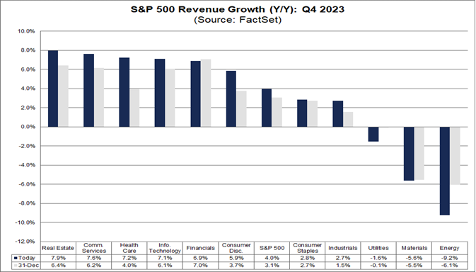 In termini di ricavi, il 65% delle società S&P500 ha riportato ricavi effettivi superiori alle stime. Nel complesso, le aziende segnalano ricavi superiori dell'1,2% alle stime, mentre il tasso di crescita misto dei ricavi per il quarto trimestre è oggi del 4,0%, Otto settori stanno segnalando una crescita anno su anno dei ricavi, guidati dai settori immobiliare e dei servizi di comunicazione. D’altro canto, tre settori stanno segnalando un calo dei ricavi rispetto all’anno precedente, guidati dai settori dell’energia e dei materiali.