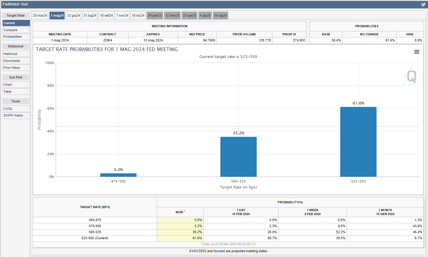 Stessa situazione per quanto riguarda la riunione del 1° maggio, si alzano sempre più le probabilità di nessun taglio al 61,6% rispetto al 39,3% di due venerdì fa, ovviamente a scapito dell’abbassamento delle probabilità per un taglio di 25 bps che dal 52,2% di due venerdì fa, crolla al 35,2% praticamente inesistenti le probabilità per un taglio di 50 bps (0,25 + 0,25% o uno da 0,50%) all’3,2% (v. grafico):