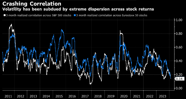 Analizziamo, però, anche le eccedenze dei mercati azionari di Wall Street che stazionano sul livello di ipercomprato da metà novembre 2023 senza mai scendere sotto il livello mediano di 50 ed inanellando 14 SETTIMANE di rialzo sulle ultime 15. Sul bassissimo livello di partecipazione del totale delle società di ogni listino abbiamo già detto molto nell’articolo di lunedì scorso e non c'è granché da aggiungere. Cameron Crise, un noto ‘macro strategist’, ha notato un'altra peculiarità di questo particolare periodo. La correlazione tra le azioni è nuovamente ai minimi storici. Come si nota nel grafico seguente, la correlazione realizzata a 3 mesi tra i membri dell'S&P500 è crollata a 0.14, e lo stesso ha fatto quella tra i membri dell'Eurostoxx 50.